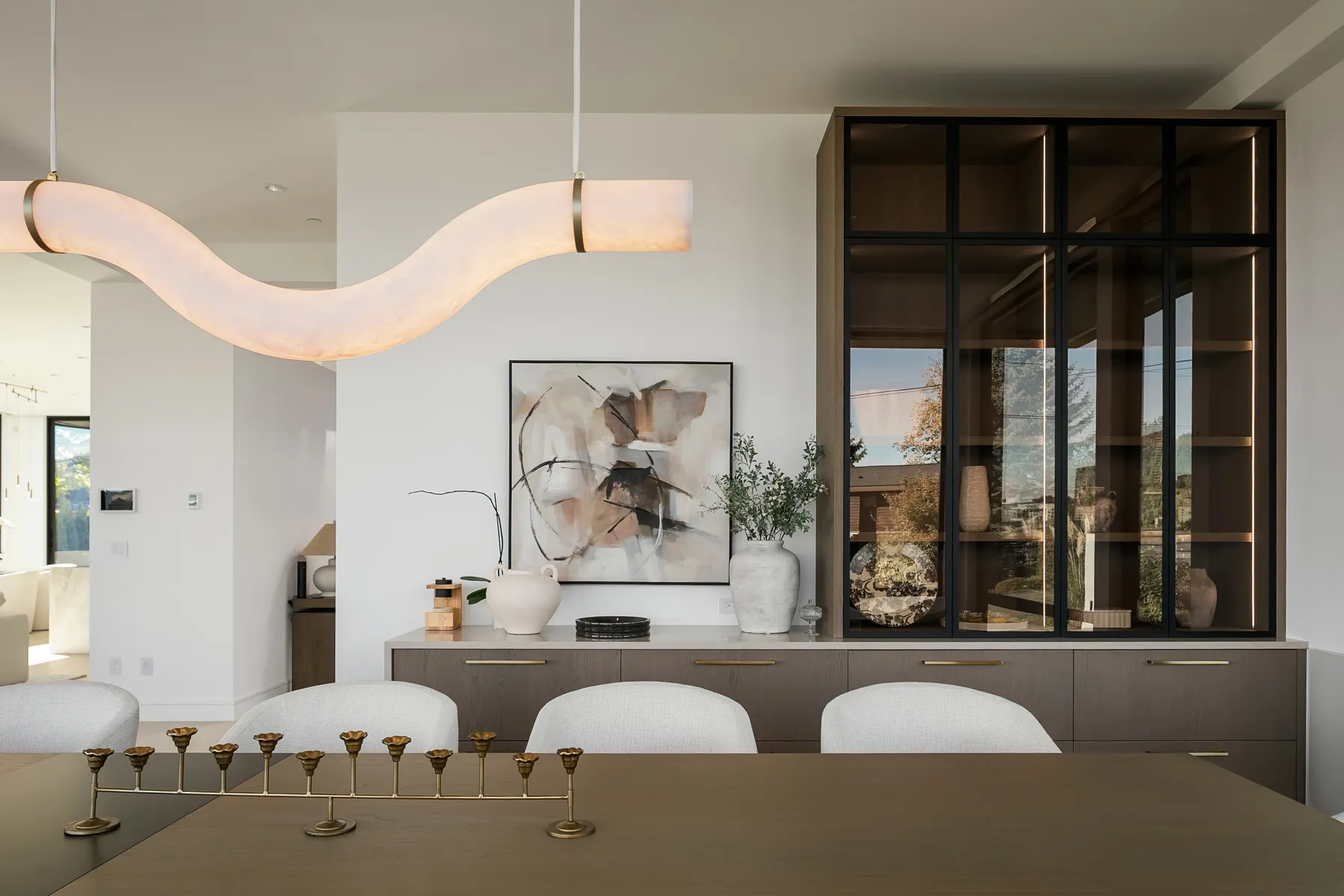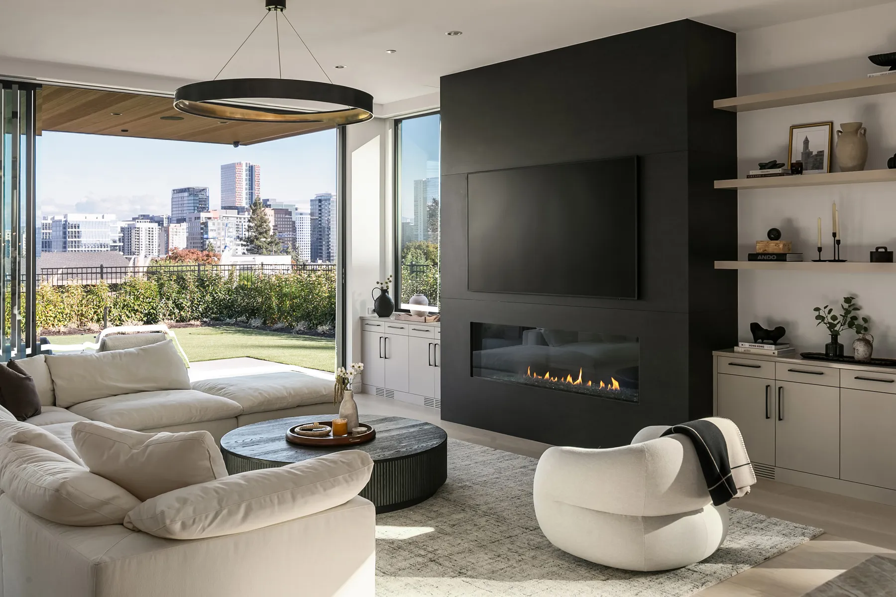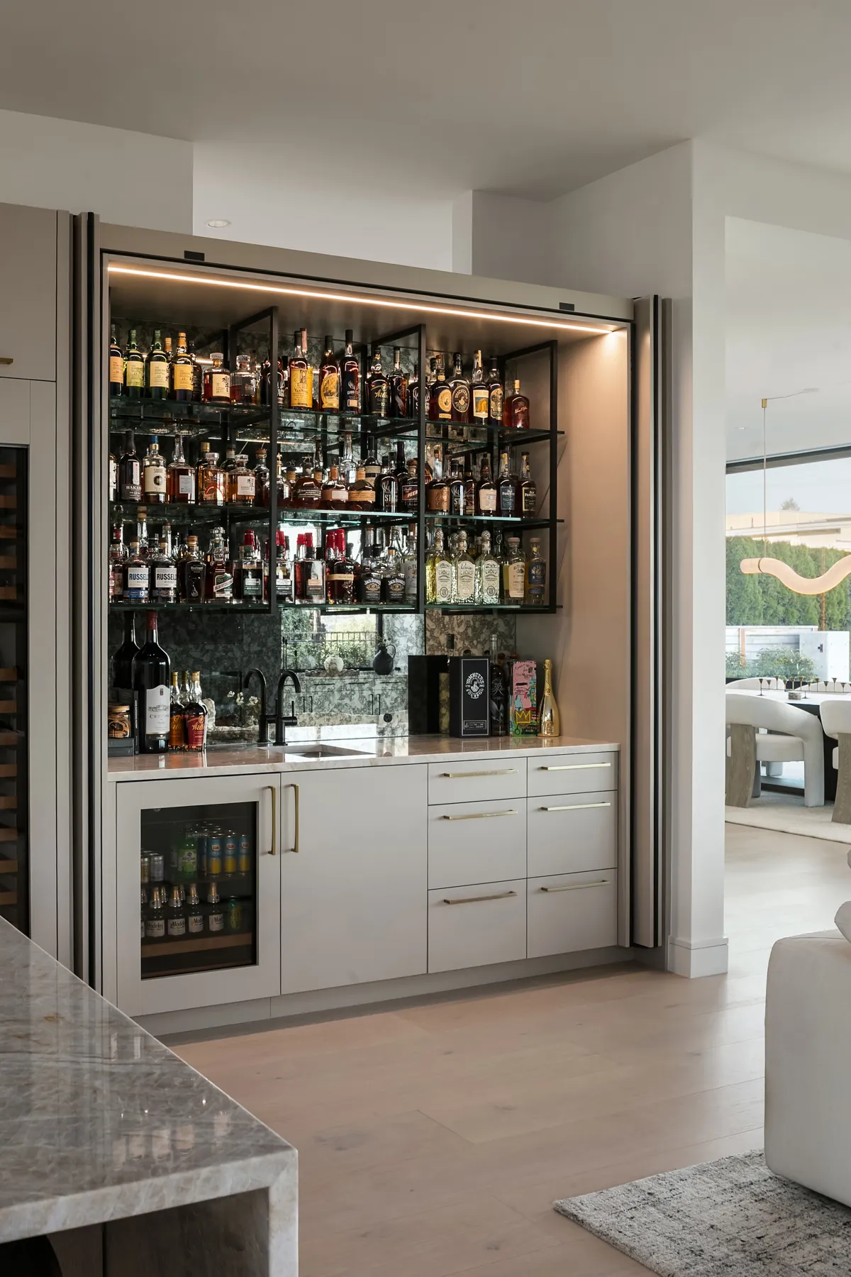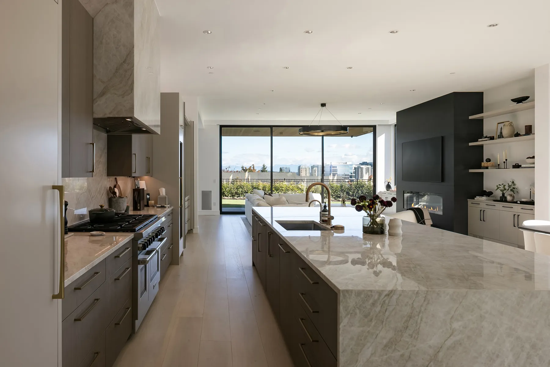 Project Description: Overlooking the stunning downtown Bellevue skyline, this project features soaring ceilings and expansive windows that demanded seamless cabinetry. Our clients desired a sophisticated blend of warm custom-stained white oak with crisp painted finishes, accented by integrated LED lighting throughout the kitchen and adjoining spaces. Euro-style cabinets with full-access frameless construction incorporate premium BLUM hardware, including soft-close drawers and lift-up systems for effortless functionality. In close collaboration with the design team, we crafted and installed a tailored, high-end solution that perfectly complements the home’s modern elegance and panoramic views.