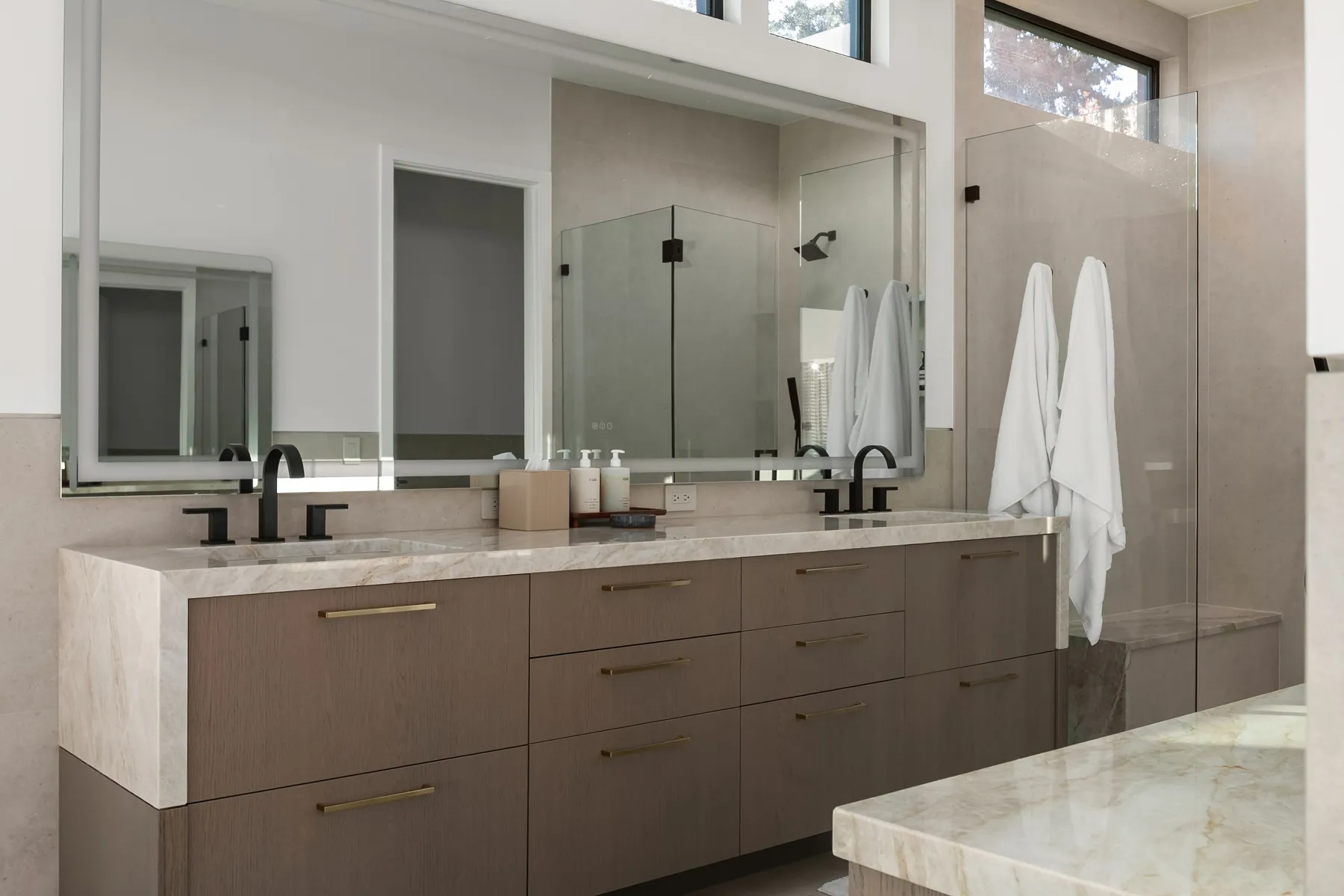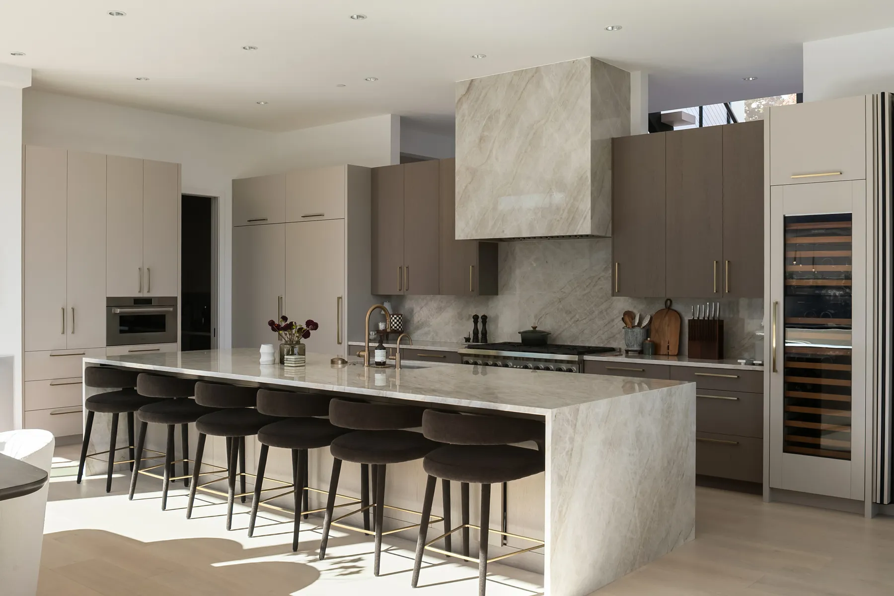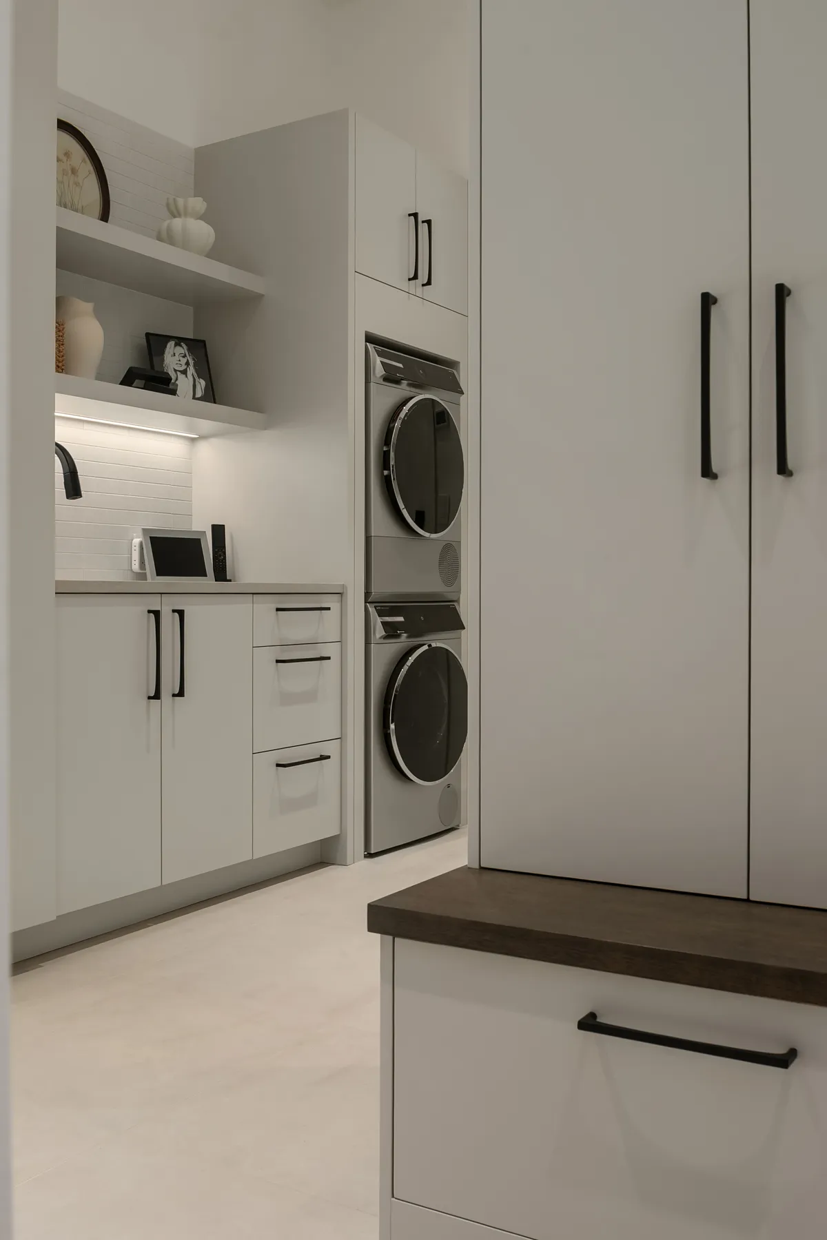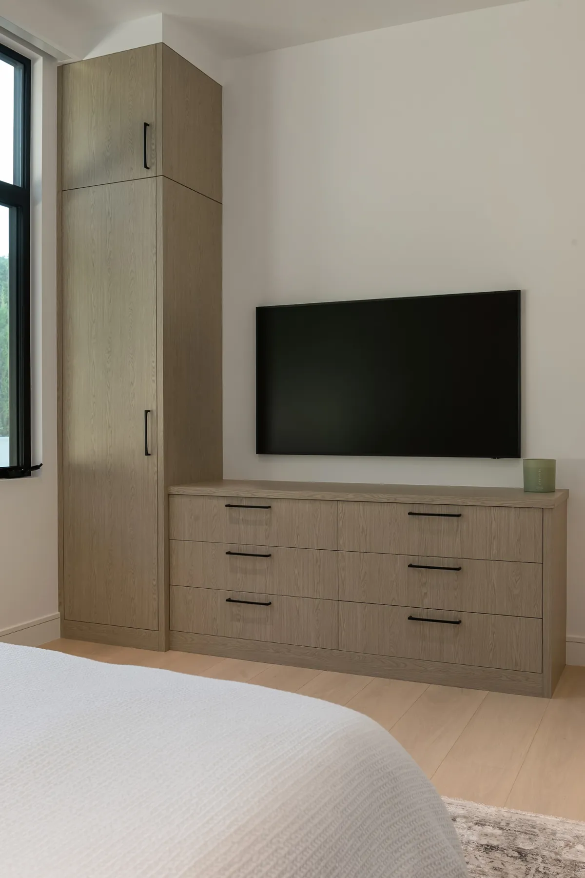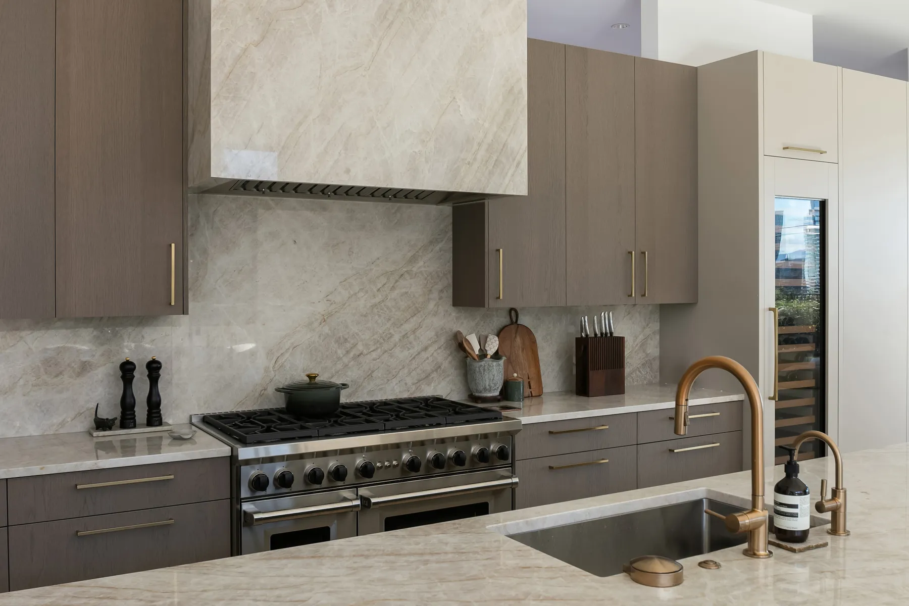 Project Description: Overlooking the stunning downtown Bellevue skyline, this project features soaring ceilings and expansive windows that demanded seamless cabinetry. Our clients desired a sophisticated blend of warm custom-stained white oak with crisp painted finishes, accented by integrated LED lighting throughout the kitchen and adjoining spaces. Euro-style cabinets with full-access frameless construction incorporate premium BLUM hardware, including soft-close drawers and lift-up systems for effortless functionality. In close collaboration with the design team, we crafted and installed a tailored, high-end solution that perfectly complements the home’s modern elegance and panoramic views.